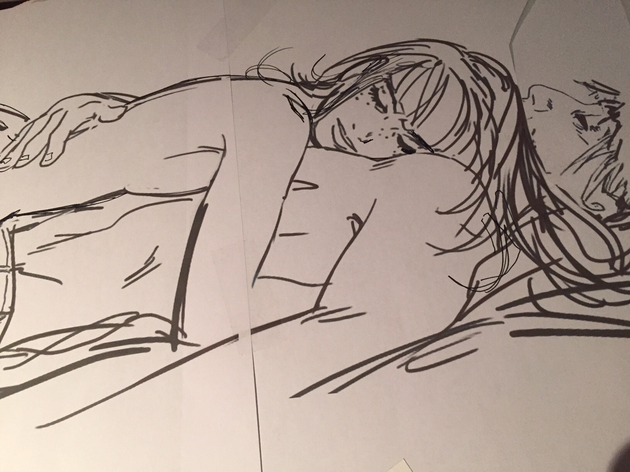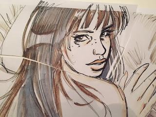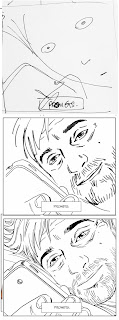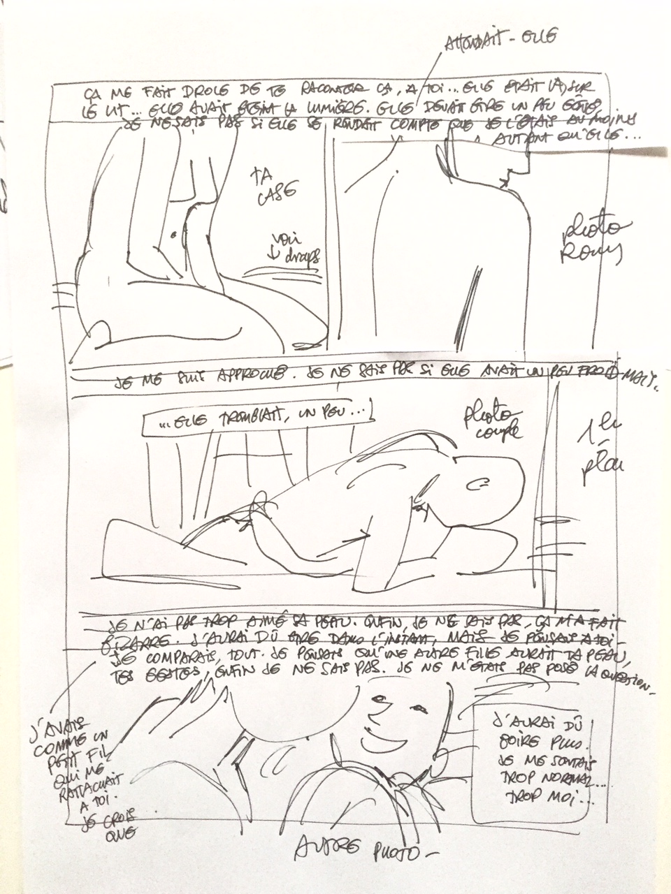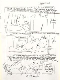 Là, je vous montre les roughts scénario d'un nouveau projet qui me semble en bonne route, qui nous emballe le dessinateur et moi. Le projet est encore assez mystérieux pour nous, en même temps que le dessinateur s'essaie aux premières planches, je prends des notes, je réfléchis à son contenu, comment la première idée excitante peut et doit se se développer... Est-ce que je saurai l'écrire, est-ce que le dessinateur saura le dessiner ?